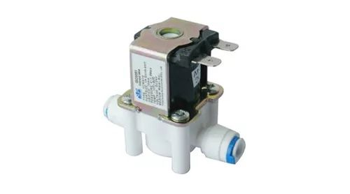 进水电磁阀在净水机中的位置处于第三级滤芯出口,在机器不工作时它是常闭状态,即水是不能通过进水电磁阀的(在不通电时,电磁阀线圈不产生磁力,阀芯不能被吸上去,水则不能通过,相反,通电状态下,线圈产生磁力,阀芯被磁力吸上去,水则能通过),也就是说停机状态下,从电磁阀后面,增压泵前没有水,当净水机通电时,进水电磁阀打开,水就可以通过。